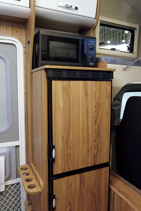 長期旅行に欠かせない大型冷蔵庫は容量148ℓタイプのものが取り付けられた。冷凍庫には48ℓもの容量が確保されている。そのほかにも、電子レンジ、カセットトイレ、温水シャワーなどが標準で装備されている豪華な仕様。