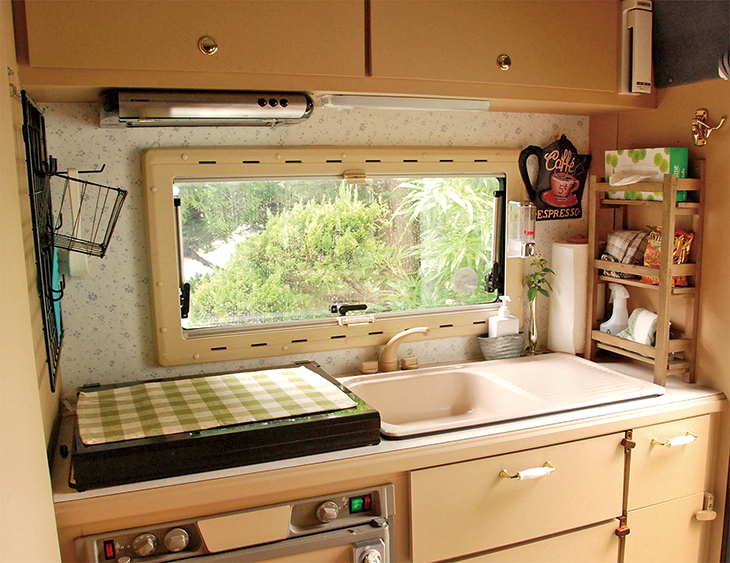 「前車はVWT4ベースのイギリス車(AUTOHOMES社エクスプローラー)で、建築家の前オーナーがオフィス化して元の壁などを変えていたので、英国調に戻すために妻と相談してキッチンの壁の1面だけを花柄に張り替えた。近所のホームセンターで購入。面積も少ないので簡単にイメージチェンジができ、ちょっと家らしくなりました。」