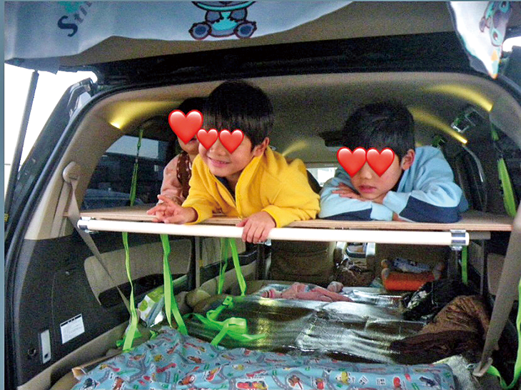 「10年程前にアルファードにつり2段ベッドを製作。100円ショップとホームセンターで材料を購入し、フレームはイレクターを枠にして使用した。フレーム枠を外し、タイトロープを引けば、天井に収納できるほか、フレーム枠も分解できるようにしてあるのでコンパネとともに収納できる。連泊時には時間の節約になり、よかったですよ。」