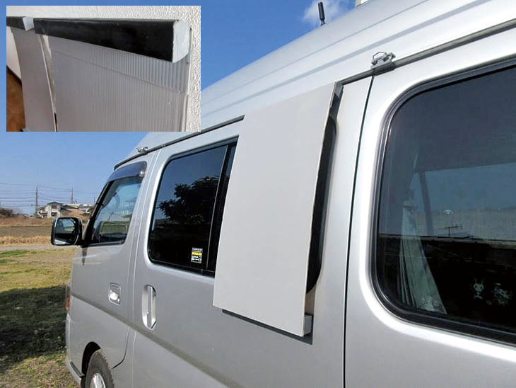 「エアコンがないので暑いときは網戸からの風を扇風機で取り入れるも、降雨時は網戸にできず蒸し暑かった。当初は雨が入らぬよう、ひさしタイプのものを作製したが、風があると雨が入ってきたりした。そこで、網戸部分をカバーする大きさの「プラ段」を、磁石を埋め込んだ上下の木製の横材に取り付けた。これを2枚作製し、車体の両側の網戸の窓にセットし、自作のワンタッチ取り付け窓用換気扇を使用して、蒸し暑さをしのいでいる。」