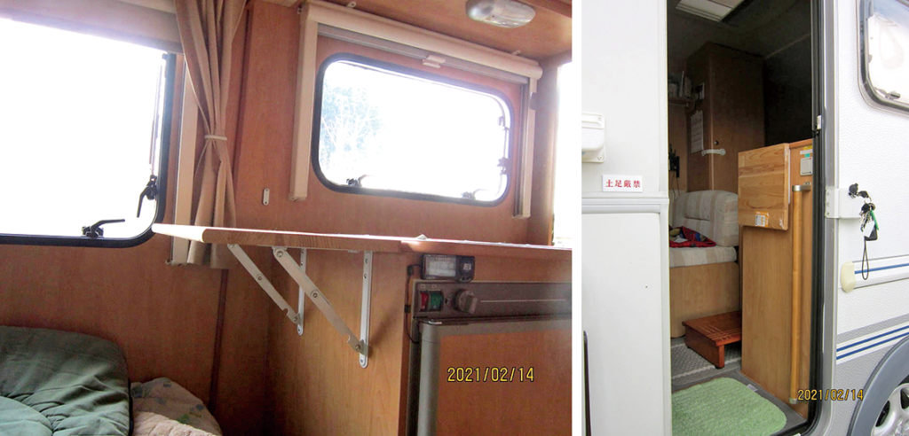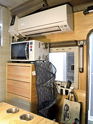 「車内の家具をヒノキ材にしました。壁やテーブル・引き出し(電子レンジの下の家具)をヒノキ材で製作。ヒノキの香りに癒されます。木材は、高いですがヒノキがいいですね。香りがいいし、耐水性があります。また、家庭用三菱ルームエアコン「霧ヶ峰」を取り付けましたが、室内機と室外機をつなぐ冷媒の配管の施工が大変でした。1回目は配管を折り曲げすぎて、穴が開いて失敗しましたが、新たに配管を買って四苦八苦して完成させました。」
