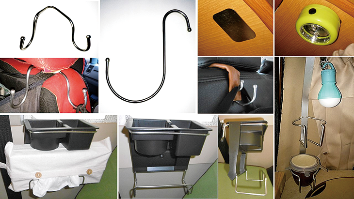 「100円ショップのステンレスフックは両端が球状で安全かつ高剛性なので、車内のフックDIY素材としてお薦め。ヘッドレストにうまく引っ掛けられるように曲げ加工すると重宝する。市販カップホルダーに取り付けて、ティッシュボックス置き場と一体化した。また、同じく100円ショップのLEDライトは乾電池の寿命が長く、配線が不要で、種類も豊富。磁石が吸着するステンレスプレートを出口上部に取り付けて、磁石付きのLEDライトを用意すれば、スポットライトと持ち出しライトになり便利。主電源オフ時の読書灯になる。」