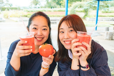 道の駅「南きよさと」の駐車場にレジストロを止めて、リフトカーに乗車。降りると広い農園や公園が広がる素敵な景色が!こちらでは、野菜の摘み取り体験の挑戦。スタッフの方に野菜について丁寧に教えていただきながら、みずみずしい野菜と触れ合うことができます。採った野菜は持ち帰る事もできるため、お土産にもなりました!作業終了後は新鮮なトマトジュースでひと休み。野菜は重たいけれど、車旅ならいくらでも運べちゃうね。