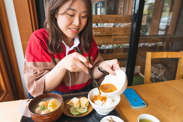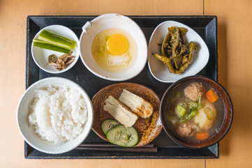 少し早めに夕食をとることに!このお店は白州郷牧場で育てた鶏や卵の直売所としてオープンした後、多くの人にそのおいしさを味わってもらうために食事スペースも設けたそう。メニューは卵かけごはんと白州鶏カレーの2つ。鶏手羽煮などのサイドメニューもありますが、今回は卵かけごはんの鶏汁付き定食をチョイスしてみることに。鶏団子もふわふわでボリュームもたっぷり!ごちそうさまでした。